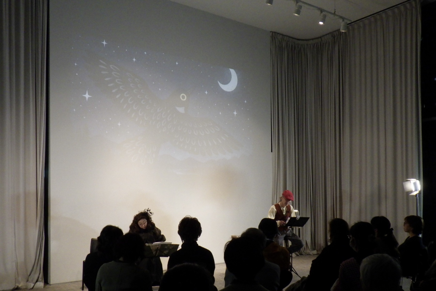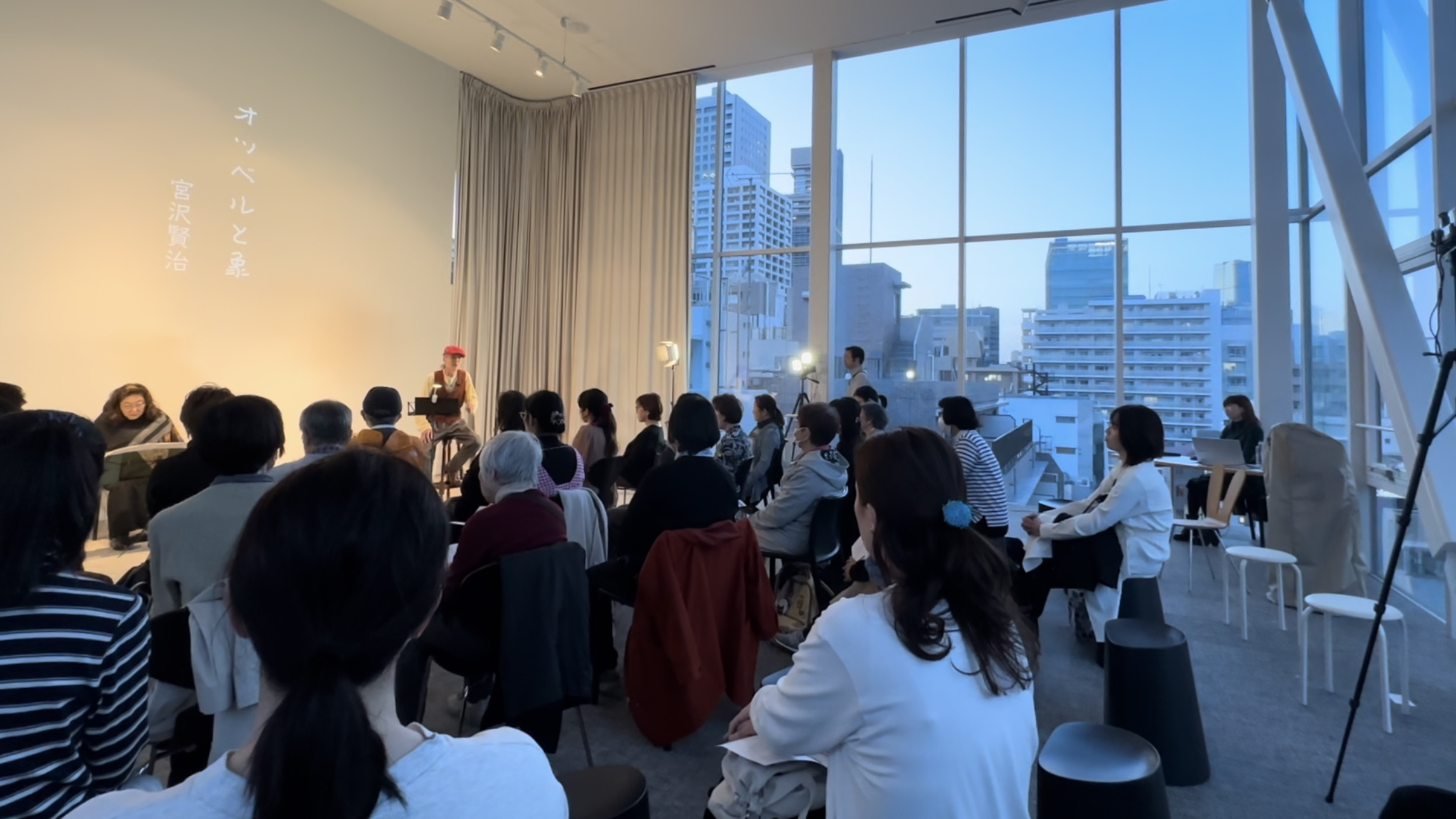 2/28(日)夕暮れ時、三方ガラス張りのSHIBAURA HOUSE 5階バードルームは熱気に包まれました。白い壁に浮かび上がる北川原梓さんによるアートワークのもと、奈佐健臣氏の声で語られる宮沢賢治作品と三浦みゆき演奏によるイングリッシュ・コンサーティーナの音色、そのなんという調和。